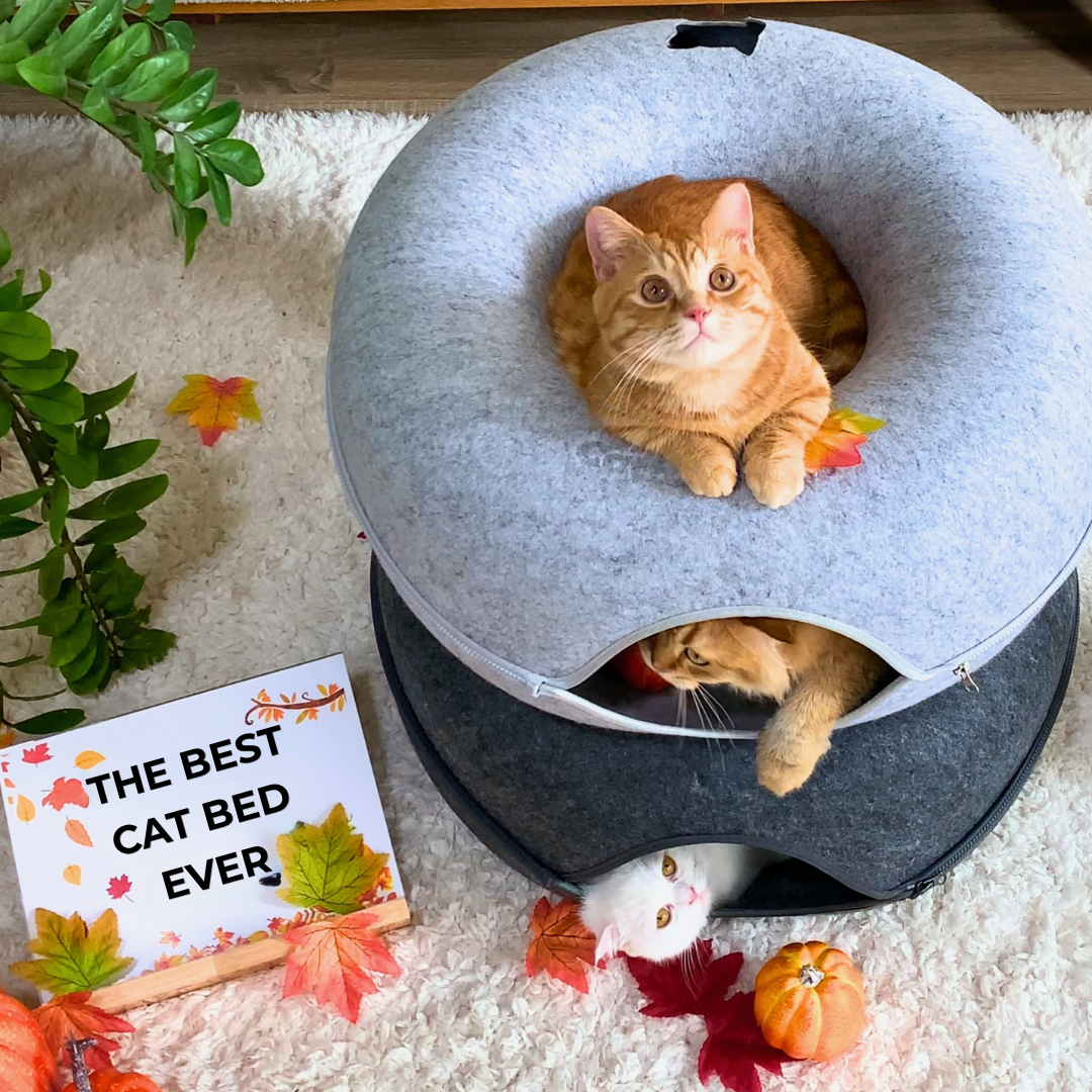 It's made from compressed, pliable fabric which is hard-molded into a donut-shaped, super cozy dwelling for cats to huddle under and snuggle in for a quiet, restful sleep or play fight with their feline friends.