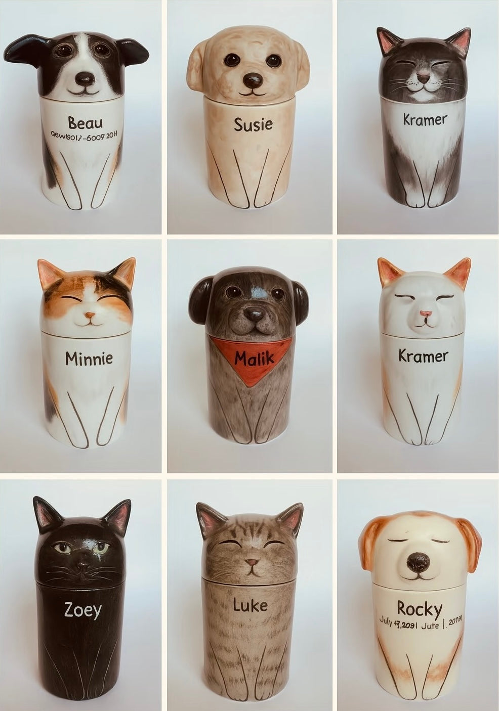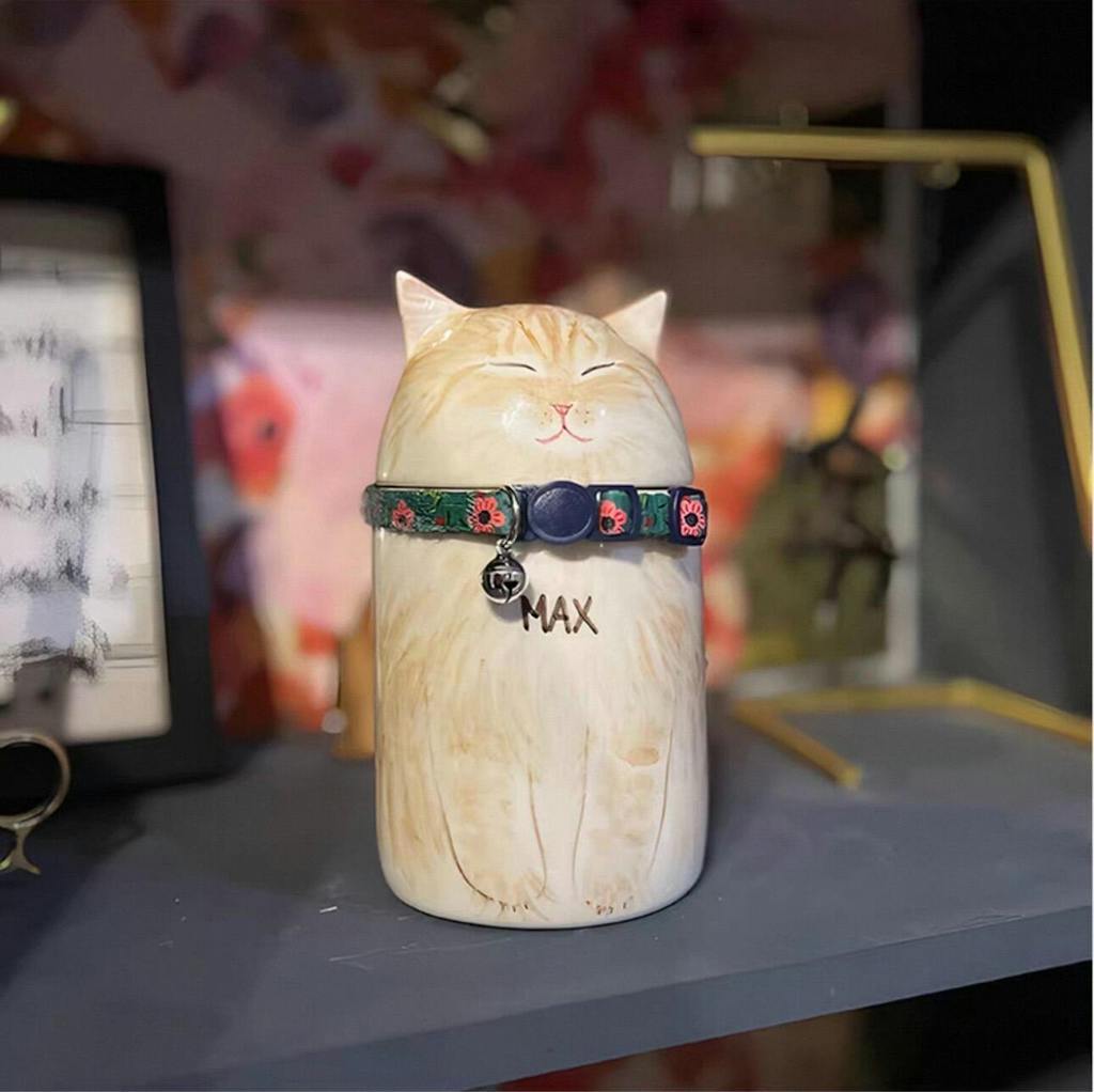 A round, cream-finished urn hand-painted with delicate florals and your pet's name pressed directly into the ceramic. A miniature pet sculpture sits atop the lid, watching over what's inside. Kiln-fired from premium clay — beautiful enough to display anywhere in your home.