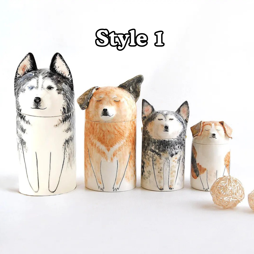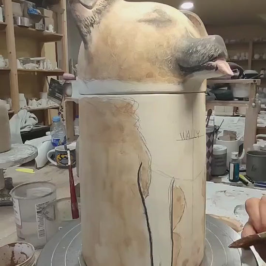 Hand-sculpted ceramic construction, fired twice for durability and a lasting finish. The lid is shaped as your dog's head — opening naturally at the neck — making the design both beautiful and functional. Personalized with your dog's name. Suitable for ashes or as a standalone memorial keepsake.