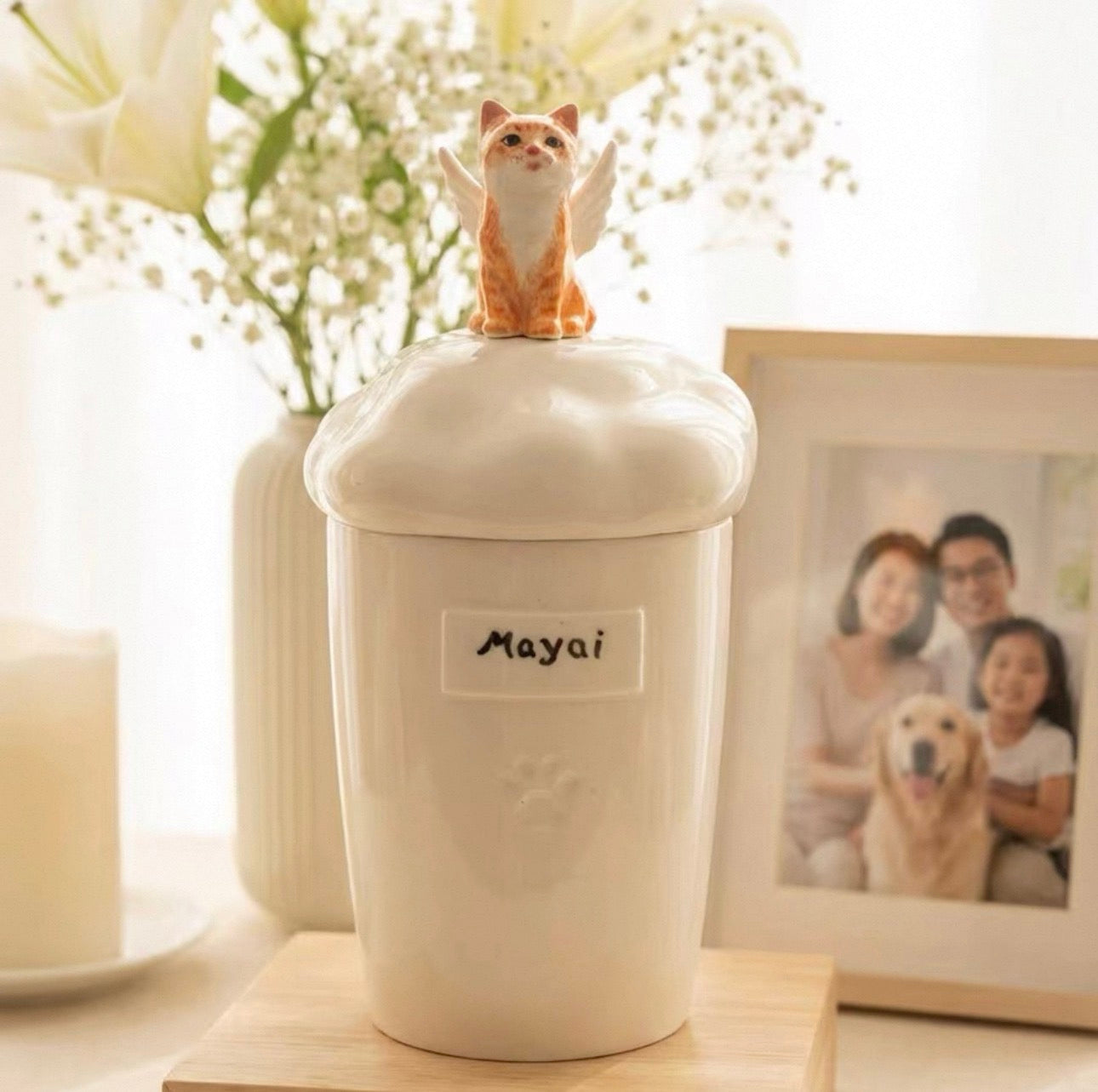 A serene ivory urn topped with a hand-sculpted angel figurine of your pet, wings spread, seated peacefully. Your pet's name is inscribed on the body alongside a delicate paw print. Crafted from high-end clay and kiln-fired — simple, symbolic, and deeply comforting.