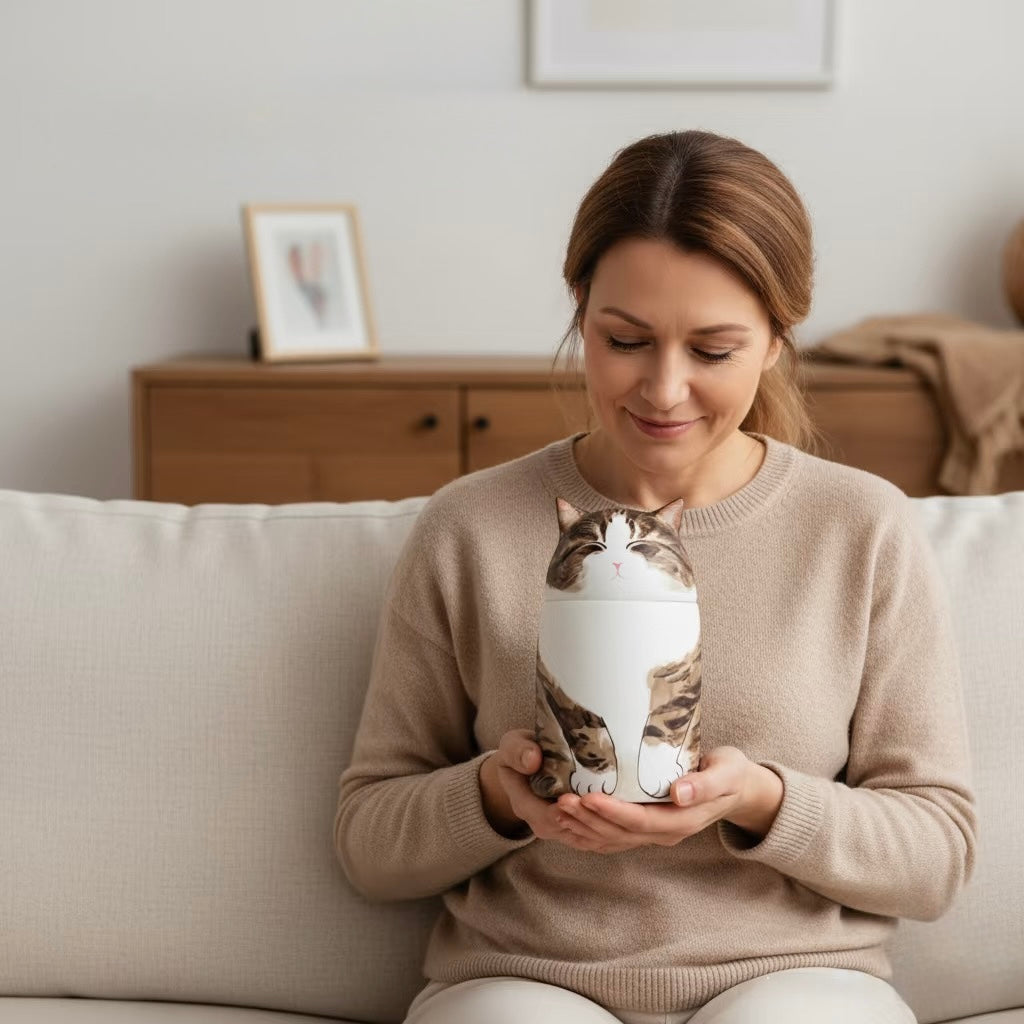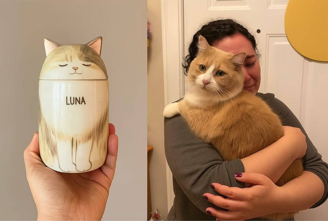 I was skeptical that a sculpture could really capture a specific cat's personality. I sent three photos and wrote a long note about her — how she always tilted her head, how her ears were slightly uneven, how she had this look of pure love all the time. The urn arrived and my sister came over and immediately started crying and said 'that's her.' That was all I needed to hear.