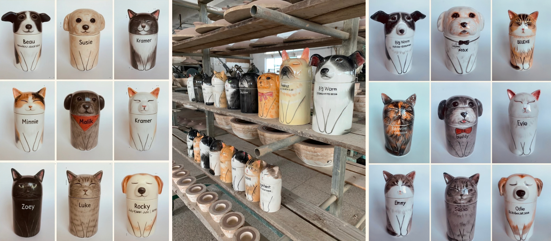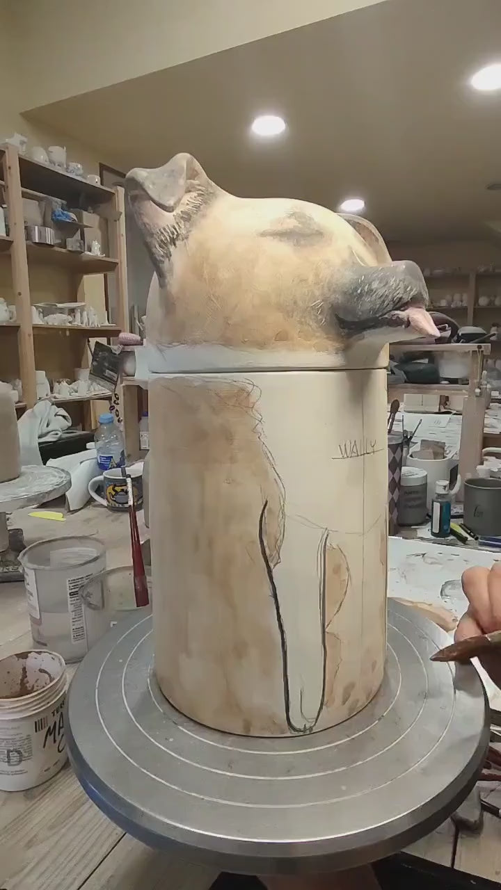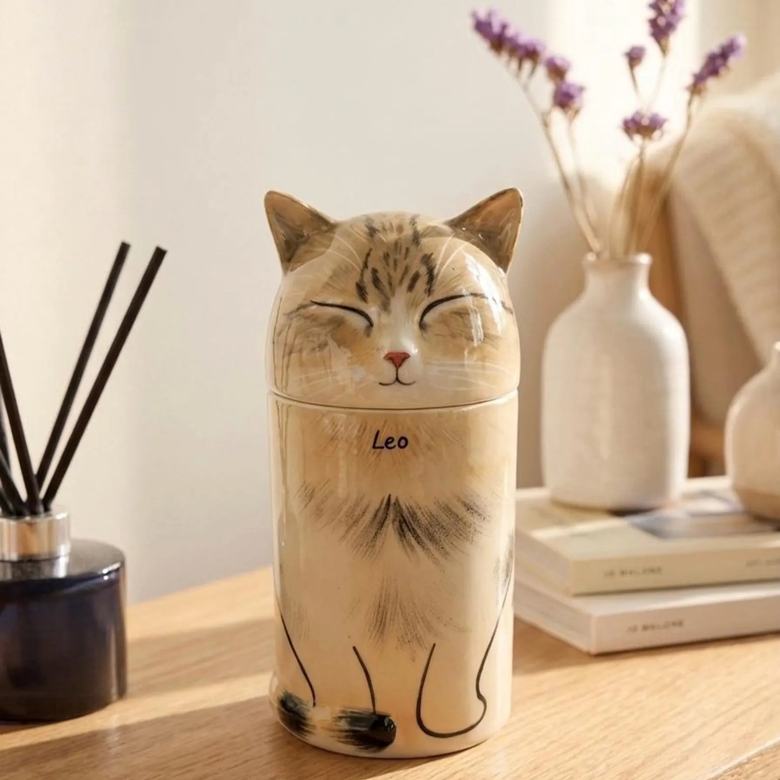 A hand-sculpted cylindrical urn featuring your pet's full likeness — coat, coloring, and expression painted from nose to paws. Crafted from high-end clay and kiln-fired for lasting durability. The lid opens at the neck, your pet's eyes peacefully closed, as if simply resting.